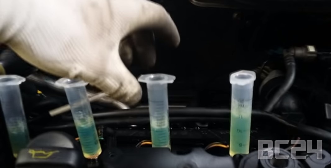Внимательно следим, чтобы не было утечки. Это очень важно. Вот уже отчетливо видно, что 4-я форсунка сливает больше чем все остальные.