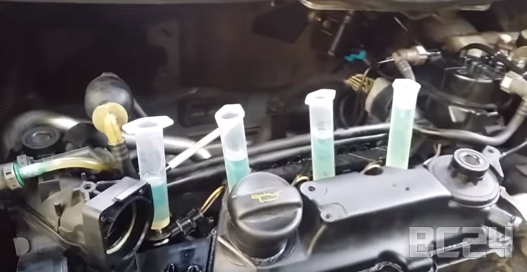 Заводим двигатель и смотрим сколько топлива каждая форсунка сливает при обратке. Норы для каждой форсунки и авто разные, поэтому ищите их в Интернете. Логика проста, подвисающая и не правильно работающая форсунка будет сливать больше топлива в обратку, чем та, которая работает нормально.