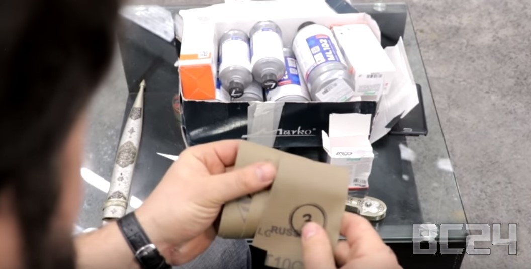 В данной коробке находится в том числе — полироль реставратор для фар. По заявлению работает на ура и стоит порядка 200 рублей. Вот мы в режиме реального времени используем данную химию на фаре и вы посмотрите результат от данного средства и сравните его с нашей работой по полировке другой фары одного авто. В комплекте с полиролью реставратором для фар мы видим набор шкурок.