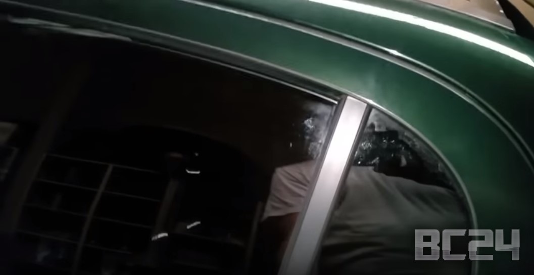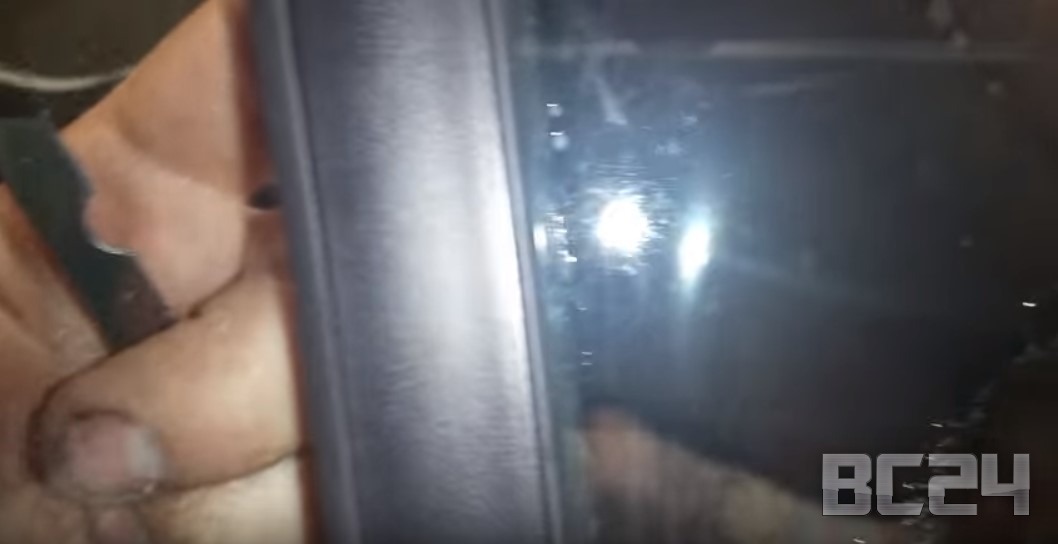 Аккуратно поднимаем стекло максимально вверх, чтобы и пленку затянуло выше и четким и резким движением отрезаем верх пленки по кантинку. В итоге мы отрежем 1-1,5 мм.