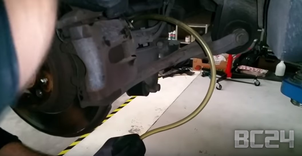 Впереди тормозная жидкость чище, так как контур спереди маленький и она ближе к бачку. Мы начинали с заднего левого колеса, вторым было переднее правое, а потом, заднее правое и последнее — переднее левое.