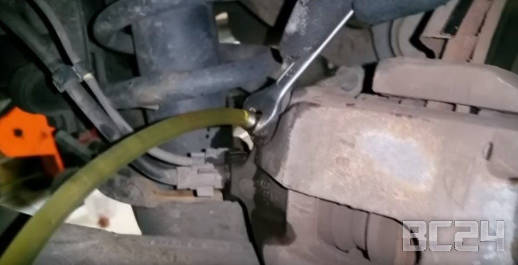 Трубку выводим в прозрачную бутылку, чтобы мы могли видеть объем вышедшей старой тормозной жидкости.