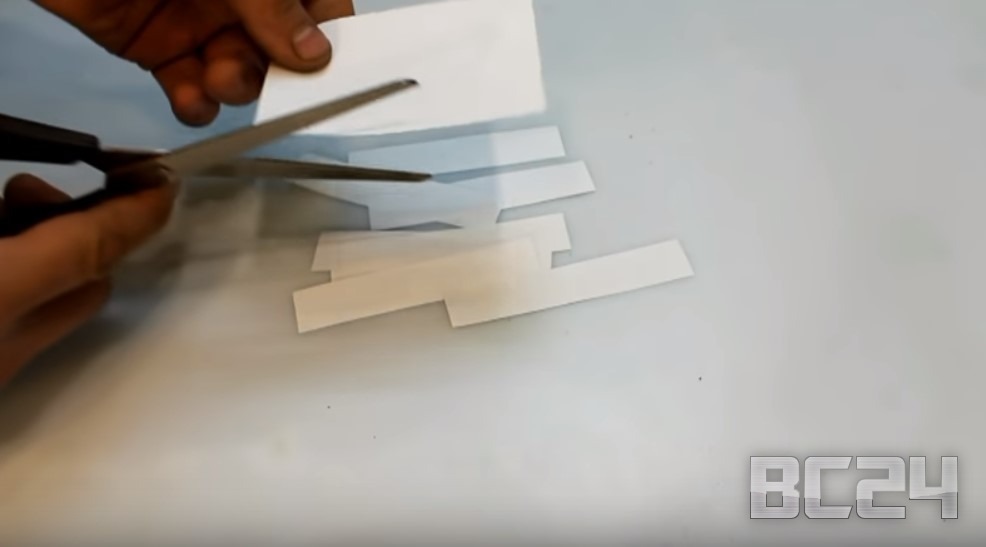 Далее нужно взять лист бумаги на нарезать его как показано на фото.