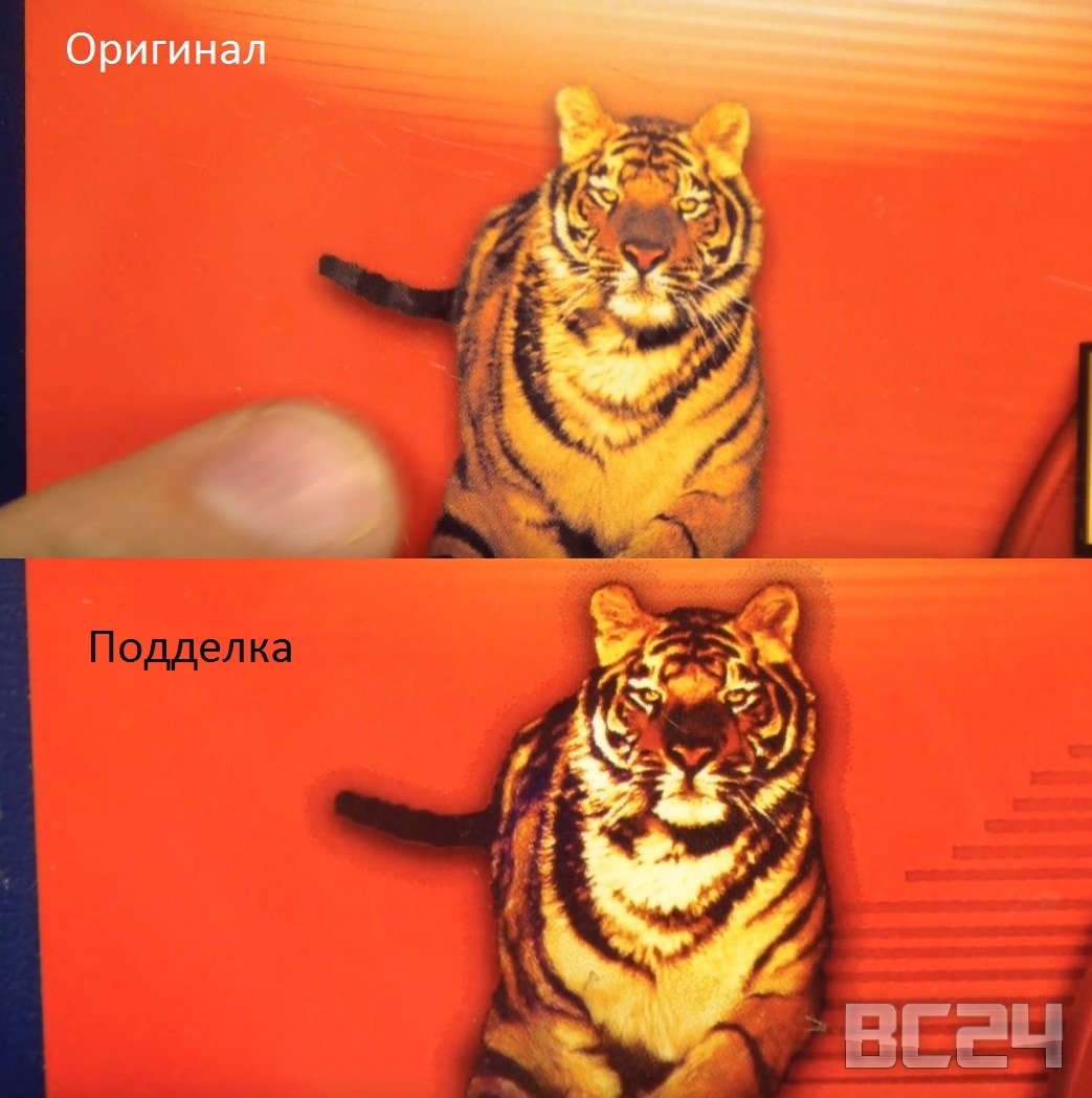 На оригинальной продукции задний фон у тигра светлый, а на подделке — темный.