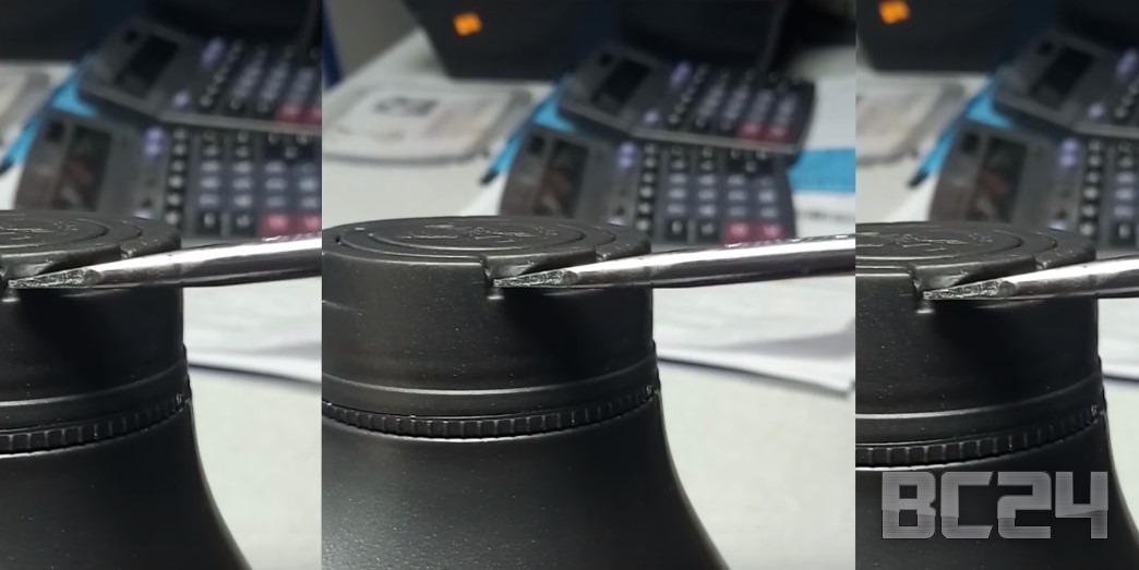 Также особенность оригинала является тот факт, что зубцы под кольцом заливной горловины — закрыты. Их сбоку не видно, только когда приподнять кольцо. На подделке зубцы видны сбоку и сразу.