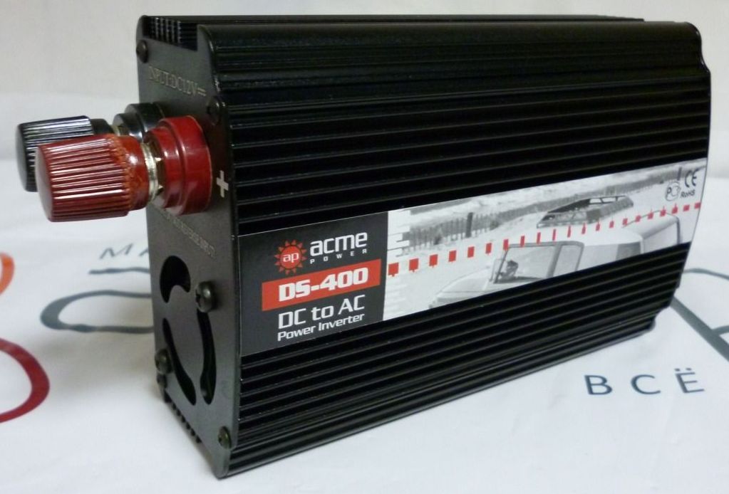 Прибор AcmePower AP-DS400 из 12 в 220 представляет собой девайс, отличительной особенностью которого от предыдущих является хороший дизайн, а также дополнительное крепление. Его необходимо подключать напрямую к АКБ, используя специальные кабеля. В схеме указывается, что мощность AcmePower AP-DS400 составляет 400 Вт, но результаты теста показали, что она едва ли дотягивает до 380. При повышенной нагрузке девайс просто отключается, но при этом, как показывают отзывы, напряжение в 220 В держит хорошо.
