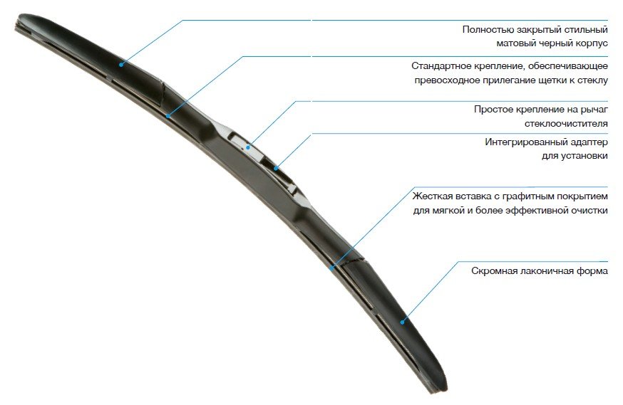 - Бескаркасная конструкция. Производителей дворников достаточно много, стоимость, соответственно, также может отличаться. Необходимо подбирать конкретный вариант в соответствии с моделью автомобиля — для Акцента, Соляриса либо Гетца. Если сравнивать с каркасными, то в этом случае в конструкции щеток будут отсутствовать компоненты, которые склонны к коррозии. В целом такой вариант является более улучшенным в плане дизайна, тем более, что он позволяет обеспечить наиболее эффективную работу системы очистки.
