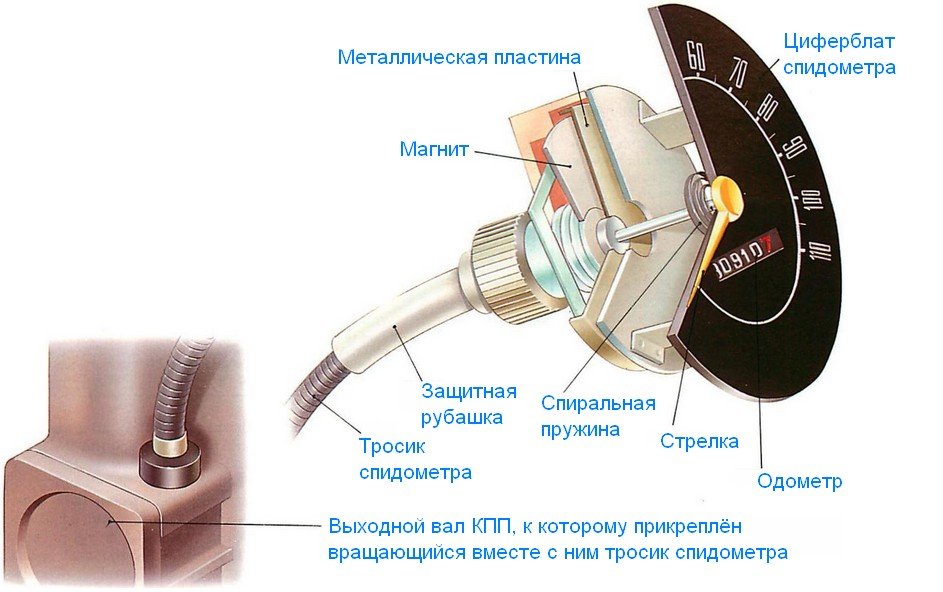В самой трансмиссии имеется специальная шестеренка. Ведущая шестерня привода спидометра вращается одновременно с выходным шкивом и она также связана с тросом. Тросик спидометра сам по себе представляет собой прочный вращающийся провод, заключенный в специальный кожух, один конец которого установлен на шестеренке, а второй — внутри прибора, на стрелке. Когда шестерня спидометра вращается, соответствующее вращение происходит и с тросом.